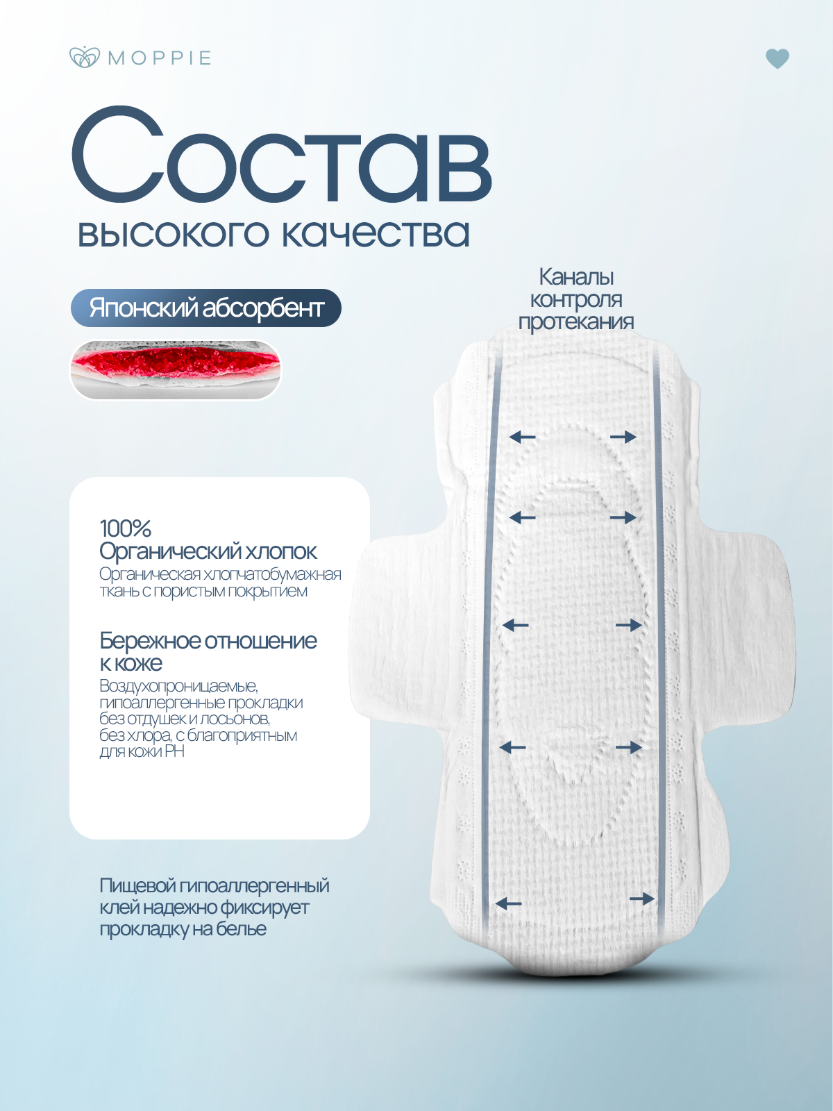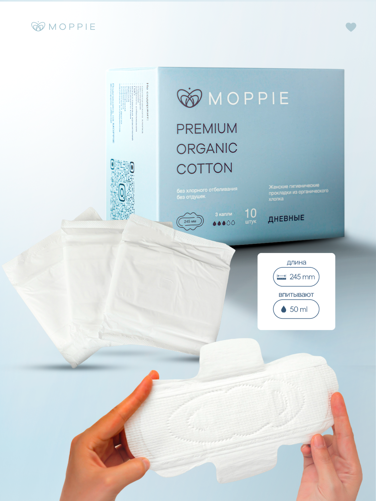 Гигиенические прокладки MOPPIE из органического хлопка обладают естественной впитывающей способностью.
